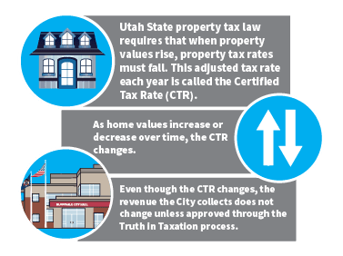 Because of the increase in home values, the certified tax would normally decrease in 2022 (the rate drops as home values rise). We are proposing to leave the certified tax rate that was used in 2021, to maintain our current level of service and to have the ability to hire a traffic officer. By keeping the rate used last year, this would translate to an increase of $11.34/month (for the average homeowner in Bluffdale) for your city portion of property tax.